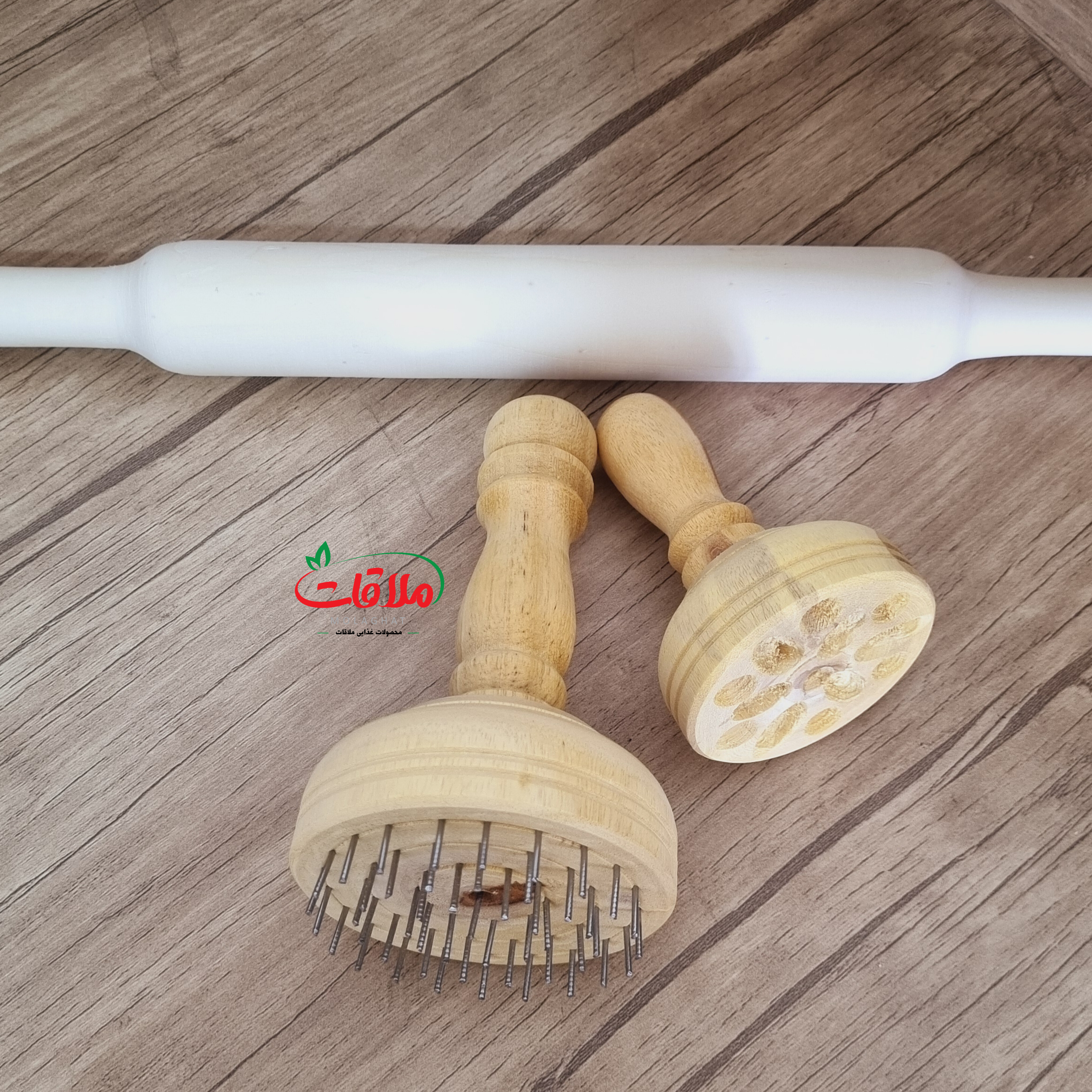 با وسایل کلوچهپزی، تجربهای شیرین و لذیذ از پخت کلوچههای خانگی را به خود هدیه دهید. این مجموعه شامل یک عدد وردنه، یک عدد سُک سُک و یک عدد قالب جهت شکل دهی به کلوچه میباشد. جنس این وسایل از چوب است و با کیفیت بالا طراحی شده اند. لطفا جهت حفظ کیفیت، با آب شسته نشوند و قبل از استفاده با روغن چرب شوند.
